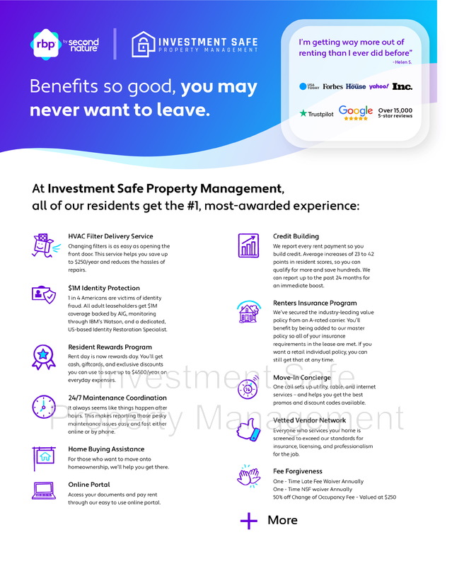 All Investment Safe Property Management residents are enrolled in the Resident Benefits Package (RBP) for $53.95/month which includes liability insurance, credit building to help boost the resident’s credit score with timely rent payments, up to $1M Identity Theft Protection, HVAC air filter delivery (for applicable properties), move-in concierge service making utility connection and home service setup a breeze during your move-in, our best-in-class resident rewards program and much more! More details upon application.